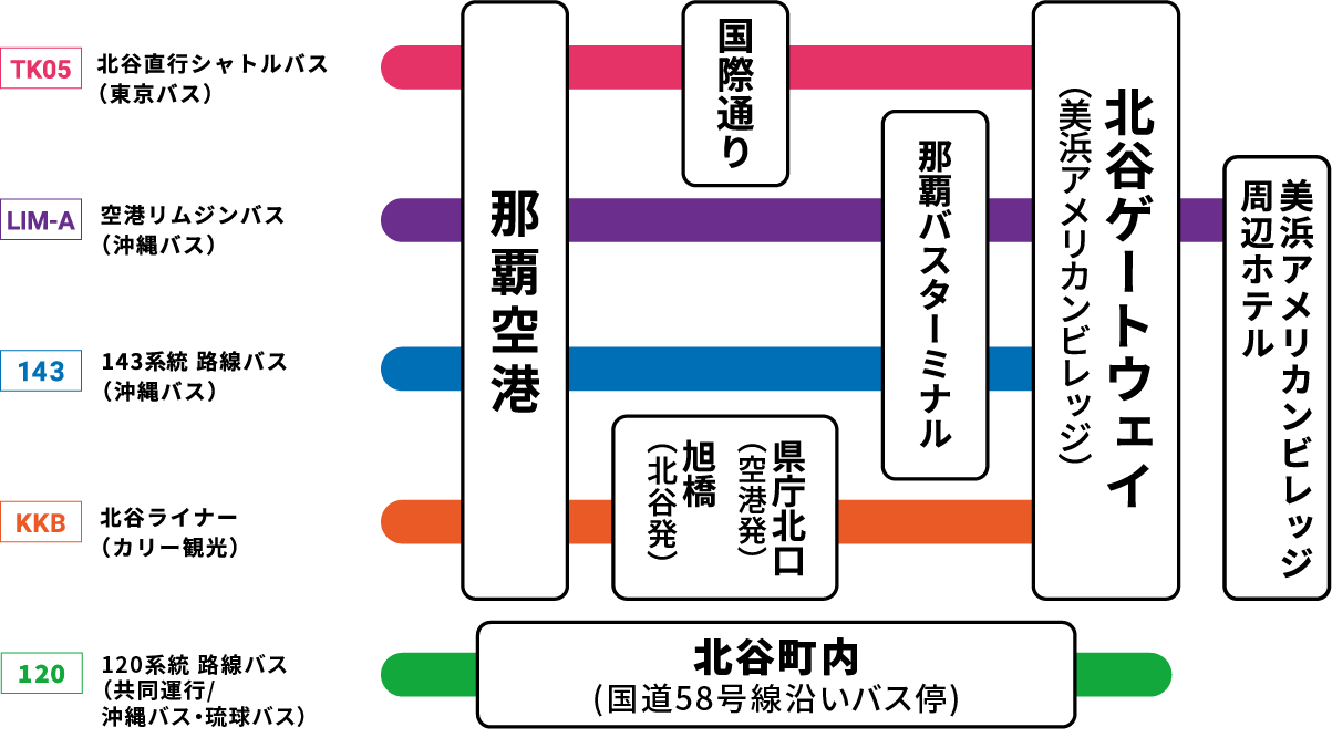 | 那覇空港↔︎北谷町 直行バス | 美ら海水族館・ジャングリア↔︎北谷町 | 北谷町内無料周遊バス |
